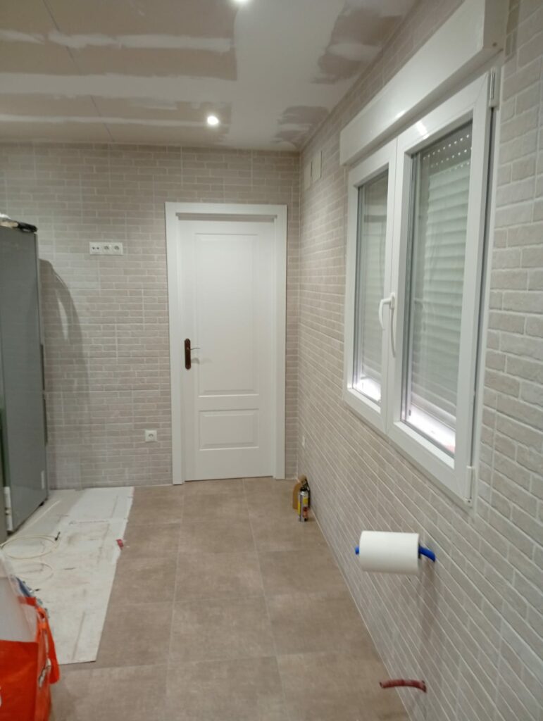 En la cocina, hemos priorizado la funcionalidad sin sacrificar la estética, instalando revestimientos que aportan luminosidad y amplitud al corazón del hogar. Por otro lado, la puerta de entrada ha requerido un trabajo intenso y ajuste estructural a medida, diseñado para garantizar la máxima seguridad y un aislamiento térmico impecable. Ver cómo estas piezas encajan es, sin duda, la mayor satisfacción de nuestro oficio.